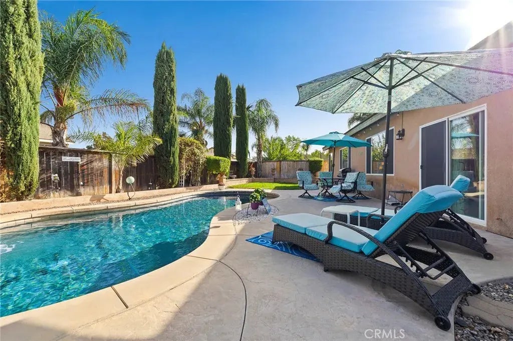 Welcome to this stunning, single story pool home located at the end of a peaceful cul-de-sac in the sought after community of Mapleton. This 4-bedroom, 2-bathroom residence boasts a spacious open floor plan with 2,200+ square feet of living space, perfect for both everyday living and entertaining. The home features gorgeous stone tile and laminate flooring throughout, offering both style and durability. The bright and airy living and dining areas welcome you upon entry. The heart of the home is the expansive kitchen and family room, equipped with a built-in sound system that creates an ideal atmosphere for gatherings. The chefs kitchen includes sleek stainless steel appliances, ample counter space, and a convenient breakfast bar. Step outside to your own private oasis in the backyard, designed for relaxation and entertainment. The pebble-surfaced, saltwater pool and spa with waterfall invite you to unwind, while the Mediterranean-inspired landscaping and natural green turf create a serene atmosphere for al fresco dining or lounging. The lush, low-maintenance yard offers plenty of space to entertain family and friends while the river rock landscaped side yard provides ample space for a dog run or play area. Additional features of this home include a 3-car garage, upgraded baseboards, stylish ceiling fans in every room, chair railings, new hot water heater, newer HVAC unit, new window screens throughout. These features are in addition to the home's prime location near walking and hiking trails and the community park. The park features sports courts, an RC track and a playgrou