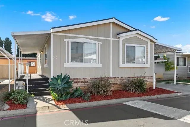 STOP the car! our new home is move in ready! New turn key, 3 bedroom 2 bath, everything you look at is practically new, new drywall, new flooring, new roof, new a/c, new blinds, new blinds, new light fixtures, new cabinetry, new interior & exterior paint, new glazing of shower and tub, new dishwasher, Large spacious Covered carport fits up to 3 small vehicles. Community features: Solar inground Pool, spa, Community club house which you can rent for those special parties with a full kitchen, walking distance to center of amenities; grocery stores, theatres, shopping, transportation and close to medical offices and hospitals. #1 School district. Yorba Linda Regional Park is walking distance. Traditional lending, FHA Conventional, or VA cannot be used as this is "leased land" not a "permanent" foundation. 11 Miles from The Happiest Place On Earth... DISNEYLAND. Leased land is $1,600 per month.