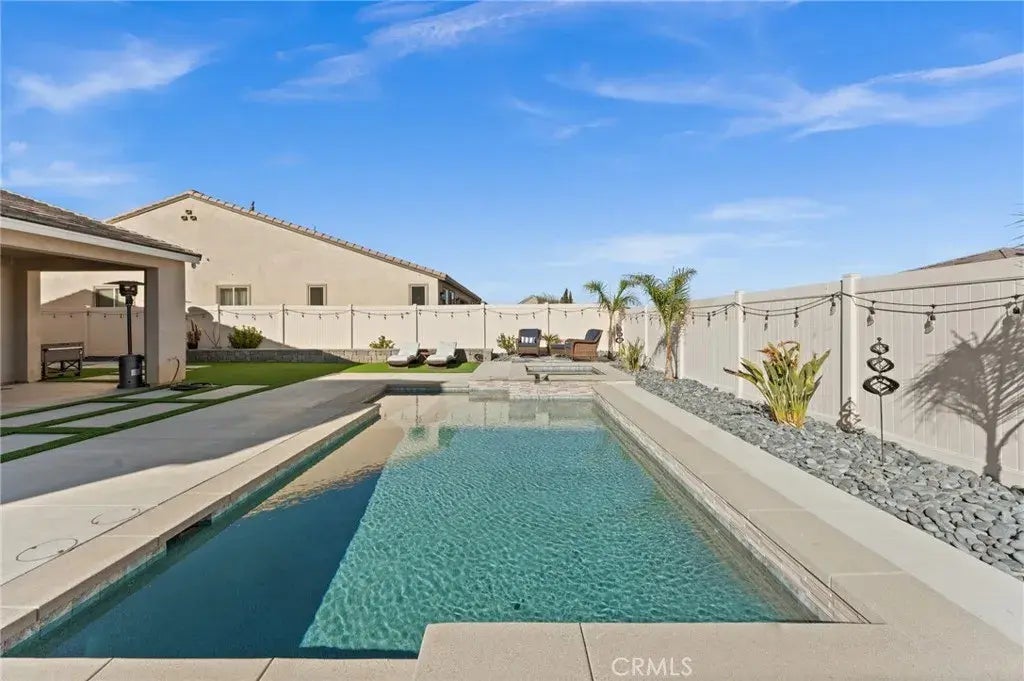 Welcome to Centennial Community of Menifee! Modern luxury living in this stunning 2021-built residence that effortlessly blends contemporary design with functionality. This beautiful home with mountain views offers an open and spacious modern floor plan and it is fully upgraded. The main floor features an entry, a bedroom, a full bathroom, an office, a gourmet kitchen with an oversized center island, and a spacious walk-in pantry with extra storage, an open dining area, a huge great room that opens directly to the outdoor California patio w/collapsing 15 ft slider. The stairs takes you to the second floor that features an oversized loft, one oversized bedroom, one standardized bedroom, one bathroom, a laundry room with a sink, a luxurious large master suite with an extensive walk-in closet and a master bathroom with a modern oversized frameless glass shower enclosure. The outdoor space is truly a paradise, with a very modern, elegant, tasteful and inviting landscaping. It features turf grass, a fire pit, a built-in BBQ kitchen island, a saltwater pebble pool and spa. It also has 3-car garage with ample room for storing seasonal decorations, sporting equipment, lawn tools, bicycles, and more. This home is a smart home and very energy efficient, with large windows, ceiling fans, upgraded cabinets, quartz countertops in the kitchen and bathrooms, carpet flooring upstairs, and laminate wood flooring throughout the house, 24 fully paid solar panels with roof enhancements like spikes, reverse osmosis system in the kitchen, and water softener filtration system. It is close to park