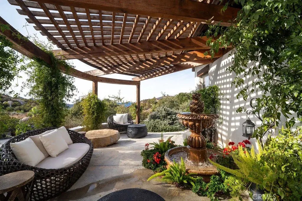 Nature and beauty at its finest! Welcome to Tenaja, where custom elegance meets rural ranch style living. This beauty features a private gated entry nestled at the top of a cul-de-sac. Modern Spanish style with a twist of elegance. The landscape of rolling hills, perfectly placed boulders, oak trees and natural plants fill this nearly 10 acre lot. Greeted by a tranquil courtyard w/custom fountain, large seating area, shade and views, this is the perfect place for a cup of coffee in the morning. Upon entering you will notice the tile floors that flow throughout the entire home, smooth plaster walls, arched doorway accents, wood framed doors and windows add so much character. The open concept floorplan is inviting, stunning fireplace w/custom tile work and mantel. The kitchen features granite counters, custom tile backsplash, stainless appliances and open to the living room. The den is just off the kitchen and features a kitchen pass through above the wine fridge, the den leads to the mud room w/dutch door and a full bath w/walk-in shower, custom vanity and rich tile floors. The primary suite offers a walk-in closet, beautiful views, a sunken royal shower, dual vanity w/granite counters. 2 additional bedrooms share a hallway bath w/custom tile work and vanity. 8.8 Kw solar system w/20 440W panels (PAID FOR) only 1 year old. Newer HVAC and water heater. Whole house fan (multi-speed) to assist in energy efficiency. The lot has a flat space below currently used as an RV pad w/water and electric (30 amp) hook ups. No HOA and Low property taxes, the perfect retreat for relaxed and