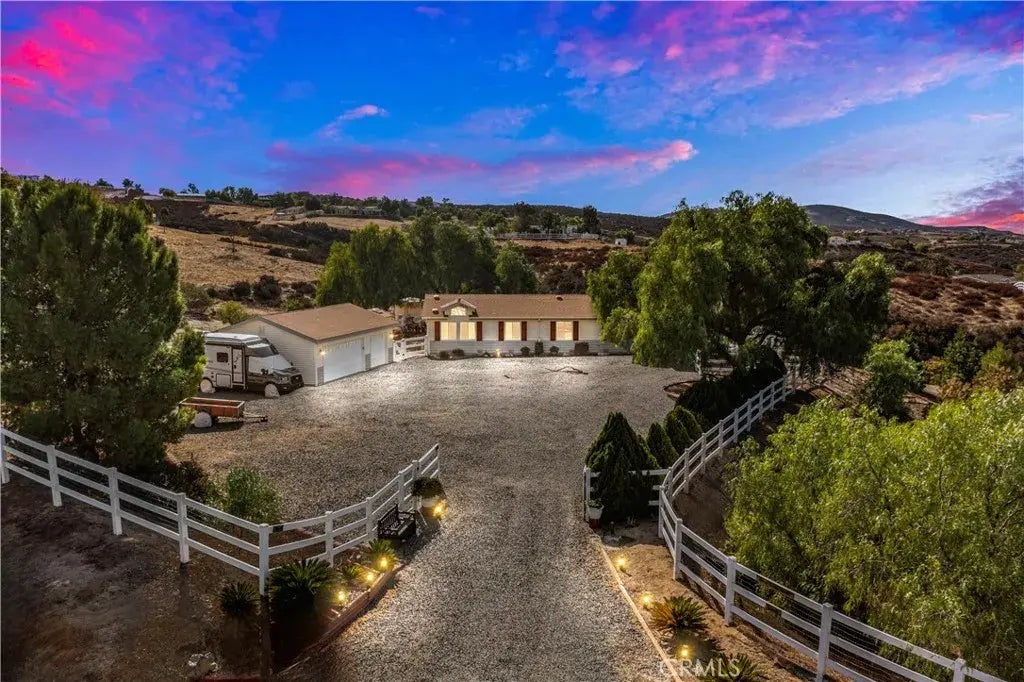 VIEWS! VIEWS! VIEWS! Welcome to the beautiful Temecula Wine Country community of Spanish Hills Ranchos tucked back off of East Benton. This beautiful equestrian community is located only minutes from Temecula's award winning wineries, restaurants, shopping and dining locations. Escape to your private retreat situated on 5 serene acres! Come explore this charming 3 bed, 2 bath home with covered porch and detached 3-car garage! This property is very unique offering the perfect blend of comfort and seclusion. A thoughtfully designed, open floor plan features spacious living areas filled with natural light, tasteful upgrades and Awe-inspiring views from every window! In the heart of the home you'll find a large kitchen complete with granite counters, custom cabinetry, dual-oven stove and a peninsula island with bar seating. This chef's kitchen flows seamlessly to the dining room- ideal for serving meals and entertaining. The main living area offers a cozy fireplace, perfect for those cooler Temecula evenings. Down the hall you'll discover 3 bedrooms including the primary bedroom featuring a massive closet and private bath with free-standing dual-sink vanity and spectacular custom step-in shower! A full secondary bathroom and spacious laundry room complete the home. Outside you'll immerse yourself in nature. Ample covered sitting areas combined with raised gardens lead to private on-site hiking trails that wind through the picturesque property where you'll experience breathtaking views of the surrounding landscape. During the rainy season, enjoy a seasonal creek flowing through