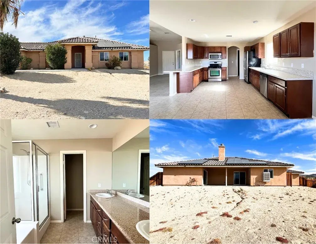 Discover this beautiful single-story home offering over 1,800 sq. ft. of open-concept living, situated on a spacious 2/3-acre lot with full privacy fencing and RV access. Perfectly designed for modern living, this 4-bedroom, 2-bathroom home blends comfort and functionality with low-maintenance benefits. Step inside to a bright and inviting family/living room that flows seamlessly into the kitchen and dining area. The kitchen boasts elegant quartz countertops and plenty of prep and storage space, making it the heart of the home. A cozy fireplace in the family room adds warmth and charm, with direct access to the rear patio and backyard, ideal for entertaining or relaxing under the desert sky. The primary suite is a true retreat, featuring a spacious walk-in closet, direct patio access, and an en-suite bath with a luxurious soaking garden tub, separate shower, dual-sink vanity, and private water closet. The front bedroom, located off the family room, offers flexibility as a home office or guest room. Outside, the expansive lot provides endless possibilities, with room for RV parking, gardening, or creating your dream outdoor oasis. Enjoy the convenience of PAID SOLAR, virtually eliminating your electric bill, while benefitting from low taxes and no HOA fees. Located just a short drive from Joshua Tree National Park, with access to iconic landmarks like Arch Rock and Barker Dam, this home offers the perfect combination of peaceful desert living and outdoor adventure. Dont miss the opportunity to make this energy-efficient home yours. Schedule a showing today and experience all