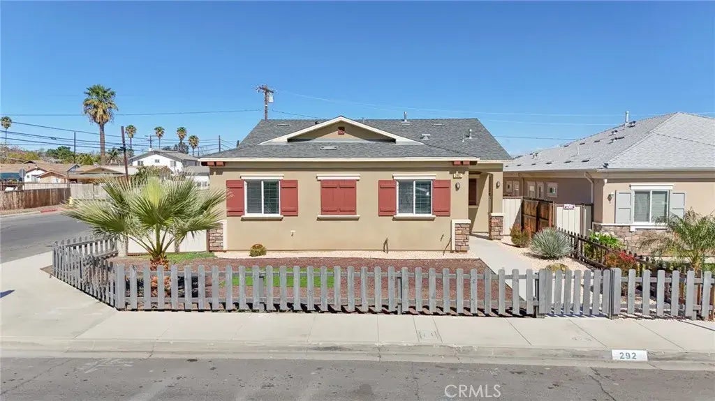 This beautiful, single-story, corner home showcases water-efficient front yard planting for added curb appeal. Inside, discover an open floorplan and high ceilings, 4 bedrooms, 2.5 bath. All tile flooring in the living room, kitchen, dining and all wet areas and luxury vinyl plank flooring all bedrooms. The kitchen boasts an island, granite countertops, stainless steel appliances. Tankless water heater. 2 car attached garage, gated driveway and possible RV parking. It is in a very convenient location, near the Metrolink station and easy freeway access. No HOA & Low Tax area.