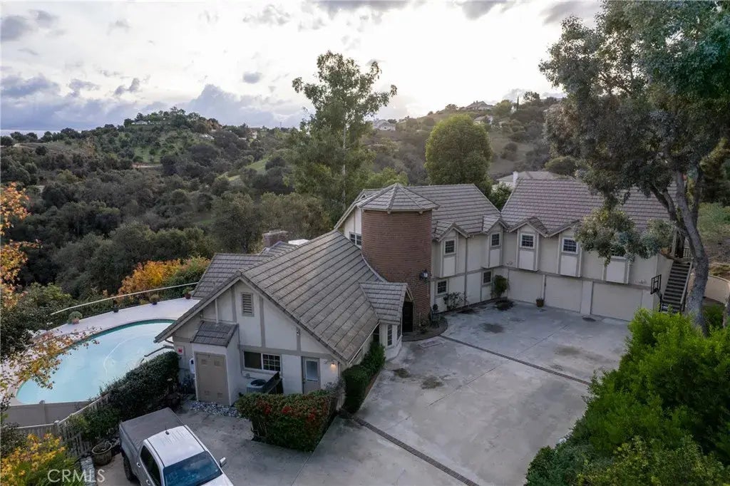 Nestled on a picturesque California hillside, situated on 1.73 acres with tranquil views of the rolling hills is this custom built Tudor Style pool/spa home with a brick turret front entrance offers the perfect blend of country living with modern amenities. Providing 5-bedrooms, 5-bathrooms totaling 3,089sf built in 1980 with a gated entry. Main residence, includes 4-bedrooms 3.75-baths, a spacious entertainer's kitchen with a center island and a peninsula, ample cabinetry, custom brickwork, breakfast nook and additional room for dining, vaulted ceilings, tiled flooring. 3 of the bedrooms are on the main level. 2 of these bedrooms have their own private full bathrooms. The 3rd main level guest bedroom is off the kitchen next to the full quest bath that includes it's own private dry sauna. Up the spiral stairs from the turret entry, will find the "very private" (occupying the entire second level) primary bedroom with it's own balcony, and very large walk-in closet, separate soaking tub and shower. Adjacent to the 3-car garage is a separate workshop. Above the 3-car garage is the separately permitted ADU / guest quarters with direct private entry. Consisting of great room, kitchenette area, separate bedroom, and full bathroom. Back deck and pool/spa area provides an expansive outdoor living with a fully equipped kitchen, built-in BBQ, heated pool / spa, patio, deck and gazebo overlooking the rolling hills and the valley below. Located along the down slope, below the home will find a paid-in-full ground mounted solar panel system keeping your electric bills to a minimum. This