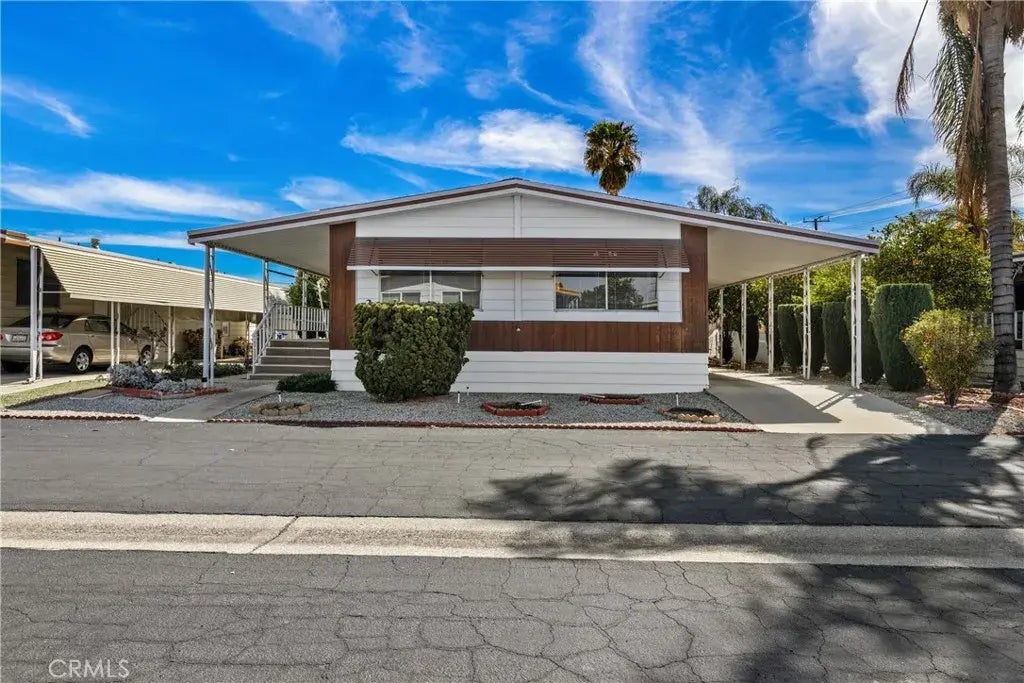 2 bedroom 2 bath manufactured home in Eden Roc Villa North senior 55+ mobile home park. Living room with beamed ceiling and front-facing picture windows. Dining area with lighted china hutch. Step-saver kitchen with 5-burner stove, Dbl oven, Dishwasher, refrigerator, and breakfast bar open to family room. Master had mirrored wardrobes, full bath with tub and separate shower. Guest bedroom has built-ins. Full guest bath with tub/shower combo. Inside laundry, includes washer and dryer. Newer HVAC system (2017) and water heater (2021). Shed and delicious fruit trees.