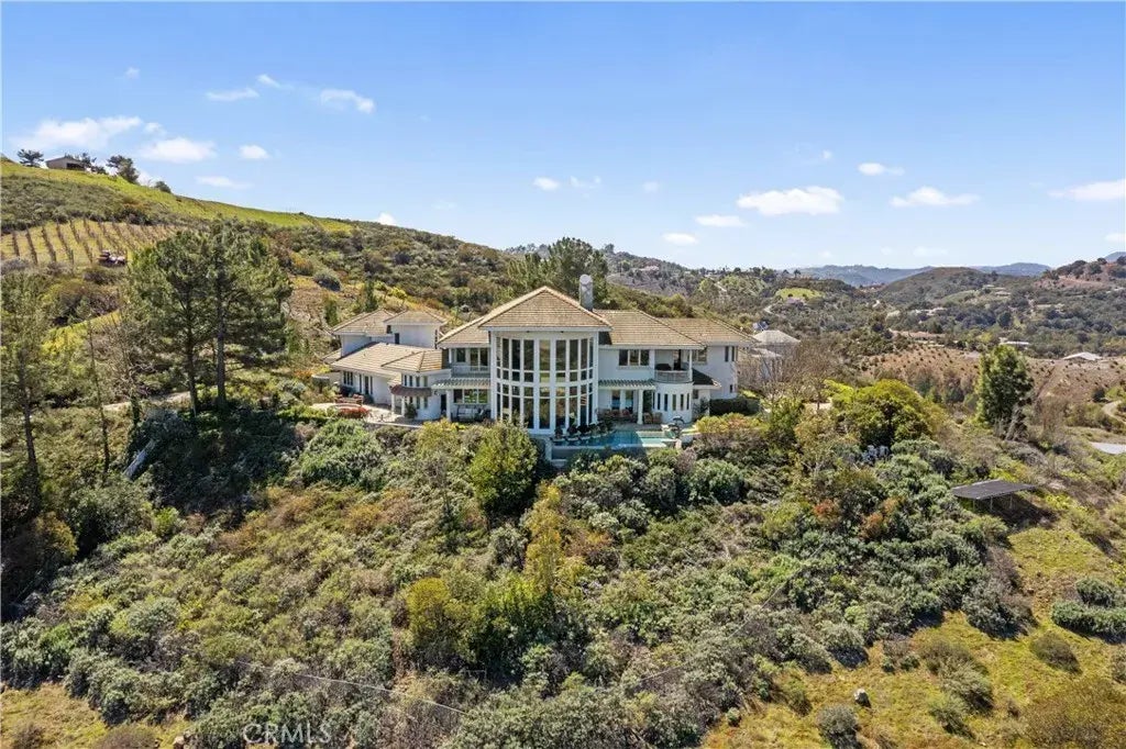Breathtaking Views & Ultimate Luxury in Temecula. Welcome to hilltop elegance where luxury living meets panoramic beauty. This extraordinary estate spans 8,724 sq. ft. and offers 6 spacious bedrooms, 7 bathrooms, and a detached guest home (ADU) complete with its own kitchen, living area, and private bedroom. Nestled on over 15 acres, the property boasts sweeping views of Temeculas city lights, a stunning vanishing edge pool and spa, a greenhouse, and even a private wine cave perfect for entertaining or collecting. From the moment you arrive, the impressive leaded glass entry sets the tone for the elegance within. The grand atrium features soaring 40-foot ceilings that frame extraordinary views of the valley and the resort-style backyard. The kitchen is designed for serious culinary enthusiasts, resembling a commercial setup with three gourmet ovens, a 6-burner stove, three refrigerators, a massive pantry, and abundant counter and storage space. A cozy kitchen-view dining area and convenient laundry facilities complete the space. Each bedroom is generously sized, many offering private balconies or scenic views. The primary suite is a true retreat, featuring high ceilings, recessed lighting, a hidden-office with views, and a state-of-the-art home theater. The luxurious primary bathroom includes spa-inspired amenities such as a jetted tub, dual walk-in showers, two private toilets, his and her changing areas, a sauna, and skylights that bathe the space in natural light. Outdoors, you'll find beautifully maintained grounds with various fruit trees including orange and lemon, a