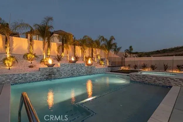 Welcome to this stunning home nestled in a resort-style 55+ gated community near Temecula's Wine Country! You'll be met by the beautifully landscaped front yard and glazed front door. Built in 2023, this single story home offers 3 bedrooms, an office, 3.5 bathrooms, and 2,318 square feet of luxurious living space. Enjoy scenic walking trails and breathtaking views of hot-air balloons, adding a unique charm to your everyday life. This home features custom laminated wood flooring, designer two-tone paint, recessed lights with dimmers, and paid off solar panels. The private master suite includes a soaking tub, walk-in shower, dual vanities, and a spacious walk-in closet. The two guest bedrooms each have their own attached bathrooms. The upgraded laundry room includes a sink and cabinets. The spacious family room is filled with natural lighting, and the chef's kitchen boasts custom Quartz countertops, a designer backsplash, an oversized island, Monogram appliances, soft-close drawers and a matching recycle bin. Sliding glass doors from the formal dining area open to a cozy courtyard. The backyard is an entertainer's dream, with a large pebbled swimming pool, a hot tub, waterfalls, fire bowls, and a spacious patio with ceiling fans, lights and a barbecue. Tropical landscaping, artificial grass and a golf putting area complete the outdoor oasis. Community amenities include a hot tub, a large swimming pool, pickleball courts, table tennis, a covered patio area, a BBQ area, bocce, a garden area, a firepit; and a clubhouse with a reception area, a billiards room, a gym, and two indo