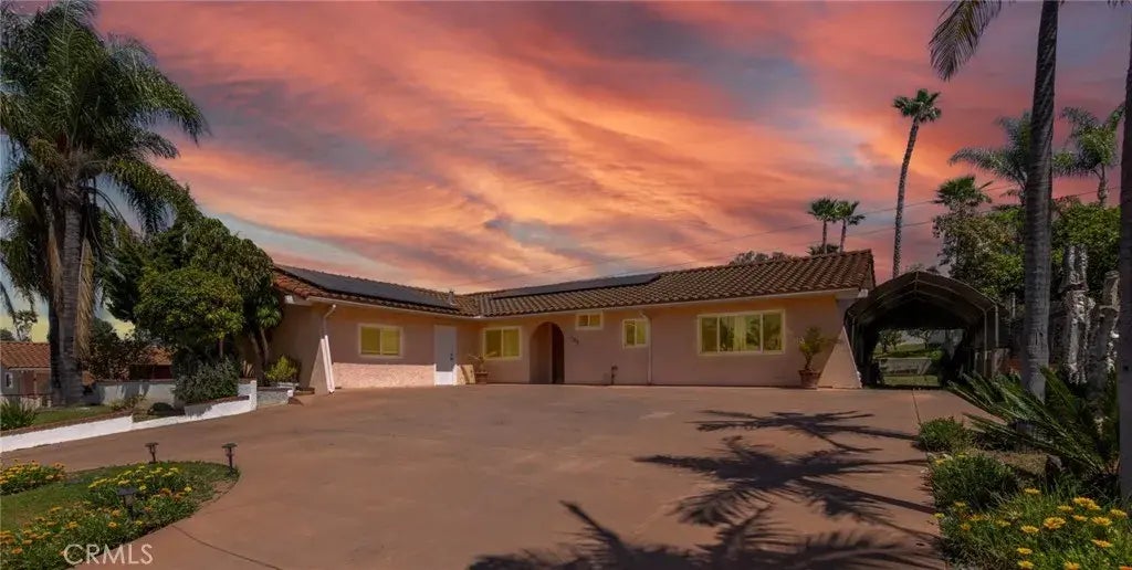 You are going to fall in love with this beautiful, custom single story nestled in the heart of Fallbrookthis GEM rarely comes available! Adorned with fruit trees, a circular driveway, and large covered patio this home gives both Spanish and Mediterranean vibes with its warmth, floorplan, and location! This 1,590 sf home boasts a HUGE lot at 13,068 sf, 5 bedrooms (2 in the garage which was converted 20 years ago) and 2 full bathrooms. The yard is completely fenced and has quite the curb appeal with stately entry and exit iron gates, several mature fruit trees, including Avocado and Meyer Lemon, plus a nice-looking shed for all your gardening essentials. The porch has views of the neighborhood, green landscaping, and surrounding hills. As you enter through the home, the living quarters are to your right and common areas at your left and center. To your left is the dining room with fan & light combo, which opens to the large, upgraded kitchen with gorgeous granite countertops, stainless steel appliances, recessed lighting, and 18 X 18 tile flooring. Continue through the door to the utility room with utility sink, washer and dryer hookups and door to rear patio. Inside you will also find two guest bedrooms with closets. This section has a separate entrance with AMAZING potential as rental units. As you make your way to the center of the home you will find a sprawling living room with brick laid fireplace that overlooks the natural beauty of the backyard and offers patio access to the oversized covered side patioan idyllic entertaining spot for family and friends! As you make yo