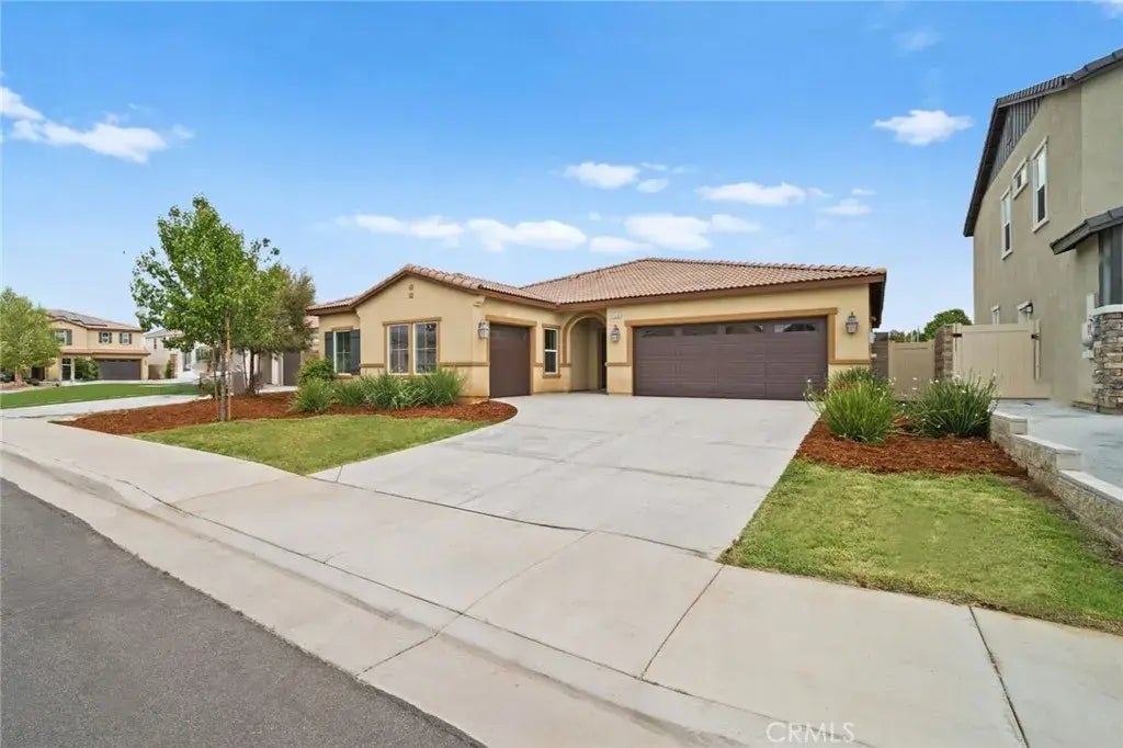 Beautiful single story Menifee family home built in 2020 located in the Hidden Hills Community. This 2,329 sf 4 bedroom 2 bathroom Spanish style California ranch with a 3 car garage and clean front yard has great curb appeal to set the stage for the "like-new" home. Finished with granite counters, fresh paint, brand new carpet throughout and LVP in commons areas. The large kitchen has an abundance of cabinetry, large walk-in pantry, large center island, white cabinets, and stainless-steel sink and appliances. The kitchen island offers central bar seating adjacent to the dining area, and shares the main space with the large and open living room laid out in true great-room form. 3 generous guest bedrooms share the 9' ceiling height with the rest of the home, and are located in close proximity to the full guest bathroom and laundry, all on their own wing of the home. The oversized primary bedroom is privately to the rear corner of the home with lots of natural lighting, with connected primary bathroom, offering a walk in shower, dual sink vanity, and a huge connected walk-in closet. To the rear of the home, the comfortable and shaded rear yard has a California room style patio cover with plenty of space and a larger side yard great for a dog run. Located walking distance from the Gale Webb Action Sports Park, schools, shopping, restaurants, town square, parks, and minutes from main freeways for communing in all directions. This is a very clean, newer, turnkey residence updated with modern style and finishes and is move in ready.
