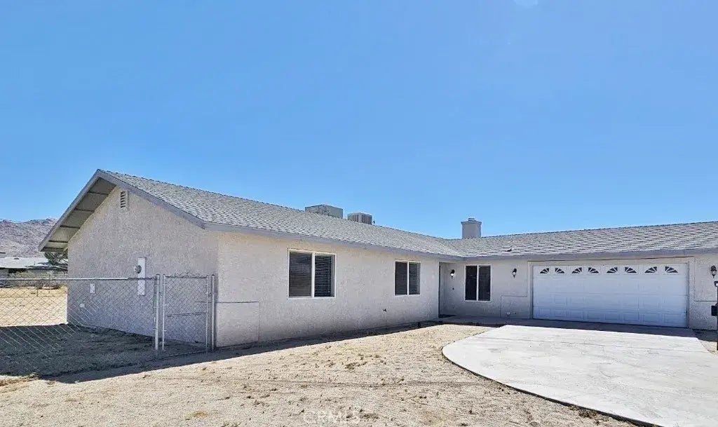 LOVELY desert abode is waiting for YOU~~! 4 good sized bedrooms, 2 full bathrooms, plus massive living room, plus eat-in kitchen. SLAB GRANITE COUNTERS & STAINLESS STEEL APPLIANCES! Opens to the Dining Area and a spacious attached Living Room with backyard access. Down the hall from the Dining Area you'll find three secondary bedrooms, a Full Bathroom with Tub/Shower Combo, and a large primary suite with plenty of room for a king-sized bed, plus two closets, step-in shower, and vanity! 2-CAR GARAGE plus driveway provide plenty of parking. BACKYARD includes covered patio, large yard, SUNRISE AND SUNSET VIEWS, and room to entertain!!!! DUAL COOL AC INCLUDED!!! Convenient to the Marine Corps Base and Joshua Tree. Rent includes kitchen appliances, plus washer/dryer (without warranty). Tenants pay for utilities and other services. No smoking anywhere on the premises. Pets / animals will be considered on a case-by-case basis. MAKE THIS YOUR HOME TODAY!!!