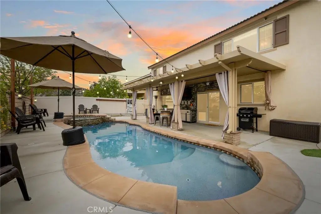 PRICED TO SELL, WILL NOT LAST! Summer nights just got an upgrade at your new poolside retreat! Welcome home to Wagon Trail Lane, where resort-style living meets everyday convenience. Enjoy a sparkling pool and spa, solar, Tesla Powerwalls, EV charging stations, and an entertainers backyard, all just a short walk from the local elementary school, Taawila. This stunning 4 bedroom, 3 bath property offers an office as well as a loft and is located in the highly desirable community of Audie Murphy Ranch, in Menifee. As you enter the property you are greeted by custom paint, tile floors and a highly desirable floor plan offering one bedroom and an office on the main floor. The spacious office features a custom-built wood desk, carpet and is across from the spacious bedroom and main floor bath offering a custom framed mirror and tub shower combo. The two-car garage boasts EV charging stations, a water softener, and Tesla power walls. The kitchen is appointed with granite counters, eat-up bar, RO water system, stainless steel appliances, walk-in pantry, wine fridge, custom chandelier and is open to the spacious family room. The family room offers a wood accent wall and floating shelves, LVP floors and a large storage closet under the stairs. The second story boasts a large loft, whole house fan, two large secondary bedrooms, a spacious laundry room, the primary bedroom and secondary bath boasting a shower, tub combo. The oversized Primary bedroom looks over the private yard with mountain views and features a custom barn door leading the way to the primary bath boasting a standing s