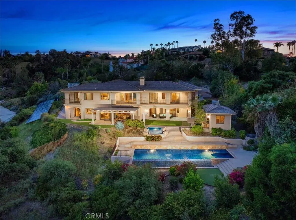 Welcome to your Tony Garczynski built custom home in The Trails of Rancho Bernardo. Built in 2010, this magnificent estate features luxury living in a serene environment. Panoramic views and outdoor entertainment enhance the overall enjoyment of this tranquil retreat. The main floor of this two story home has three bedrooms, an office with a built in desk and shelving, a living room with an Onyx fireplace and an extended balcony. The master bedroom has a private balcony overlooking the valley, a large master bathroom with a stand alone tub and spa like shower, breathtaking views and privacy. Downstairs has an open floor plan with a "great room" creating a seamless transition between the family room and kitchen. Every room on the first floor includes a sliding door to the backyard creating an indoor/outdoor lifestyle. Also downstairs is the second master bedroom which opens up directly to the outside. The lush landscaping has a resort like feel consisting of multiple patios with travertine tiles, a cabana, a built in BBQ with sink and a 50 foot lap pool with spa. The cabana includes a wet bar, bathroom and outdoor shower. The pool and spa have vanishing edges with a waterfall effect creating a perfect setting to get lost in the view. This home is accented by beautiful flooring throughout the house, solid wood doors and custom made cabinets. Ceilings in the foyer, living room and dining room have been hand painted with gold and sliver leaf to create an elegant touch. Additional features include a steam shower, fully owned solar panels and a well that produces 45 gallons of wa