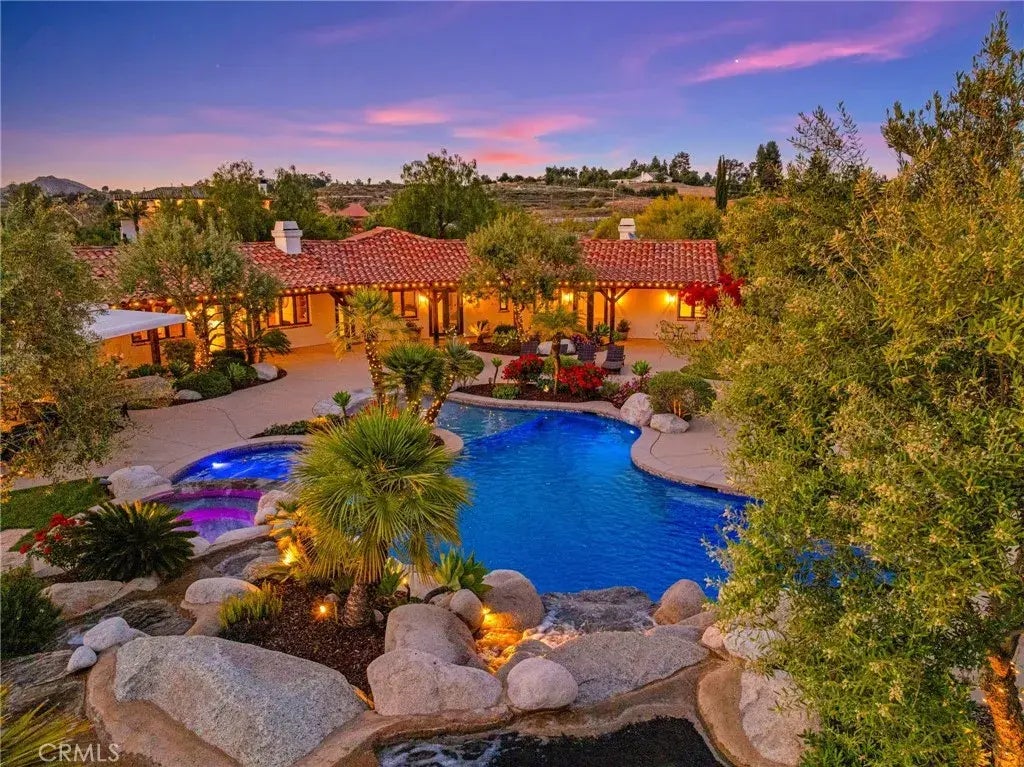 Nestled in the heart of the renowned Temecula Wine Country, this extraordinary 3.15-acre estate offers a rare blend of luxury, serenity, and natural beauty. A truly one-of-a-kind property, it includes a single-level 3,091 SF primary home with 4 beds & 3 full baths & a half bath, a spacious 1,309 SF separate guest home with 2 beds & 2 full baths, luxury barn style RV or storage space, 2 other separate garages and an outdoor oasis with truly breathtaking landscape surrounding an amazing pool and spa! The main home features four generously sized bedrooms & four bathrooms. From the moment you step inside, you're welcomed by a grand formal living and dining area with vaulted, beamed ceilings, elegant tile flooring, and a cozy fireplace that sets a warm, inviting tone. The kitchen is a chefs dream, complete with an oversized island, rich wood cabinetry, granite countertops, pantry & breakfast space. It opens seamlessly to the family room, where another charming fireplace & French doors create a perfect blend of comfort and style. The primary suite is a luxurious retreat, offering its own fireplace, access to the backyard, a spa-inspired en-suite bathroom with a standalone tub, walk-in shower, dual vanities, and a spacious walk-in closet. Down the hall, you'll find three additional guest bedrooms, built-in cabinetry & laundry room. The 1,309-square-foot guest house is ideal for extended family or visitors. It features two large bedrooms & two full bathrooms, along with an open-concept living and dining space, a fireplace, and a full kitchen with granite countertops, wood cabinetry