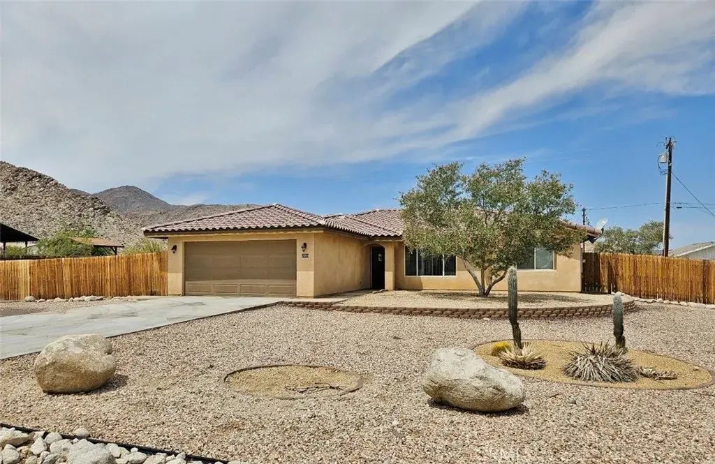 Lovely 4 bedroom, 2 bath home in 29 Palms. Great room off the entry with high VAULTED CEILINGS, RECESSED LIGHTING, CERAMIC TILE FLOORING, plus kitchen with SLAB GRANITE COUNTERS & STAINLESS STEEL APPLIANCES. Extra large Primary Suite has dual closets, dual sinks, and backyard patio access. Covered rear patio WITH NICE VIEWS TO THE WEST. The secondary bedrooms are good-sized. Garage includes built in work bench and storage. Backyard is privacy fenced with great views of the National Park. Carpet in the bedrooms, tile throughout main living areas. Laundry is inside. Side yard RV access with plenty of parking. Extra large storage shed included. Dual Cool -- A/C and Evap Cooler to save electricity! Rent includes all kitchen appliances. Tenants provide their own washer/dryer and pay for utilities/services. No smoking. Animals will be considered on a case-by-case basis. MAKE THIS YOUR HOME TODAY!!