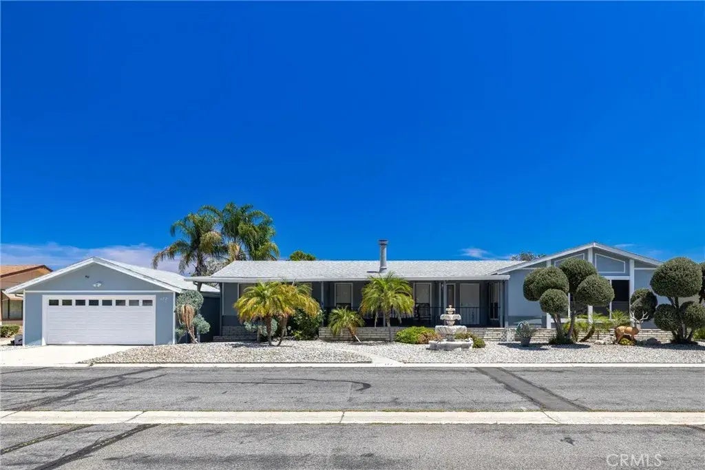 Stunning, quad-wide, split-floor-plan manufactured home with double car garage and new roof in Heather estates 55yr+ gated senior mobile home park. Spacious formal living/Dining with vaulted ceiling and ceiling fan. Galley kitchen with 4-burner gas cooktop, elect oven, 3-section sink, Dishwasher, and refrigerator. Laminated wood and ceramic tile flooring throughout. Loads of closet and cupboard space. Breakfast nook open to family room with fireplace, wet bar, and built-ins. Inside laundry with both gas and electric dryer hook-ups (washer/dryer included). Primary bedroom walk-in closet and en suite bathroom with dual sinks, seated vanity, garden tub and separate shower. Covered front porch with security screen door and rear deck with north-facing view of hills. Fruit trees include lemon, lime, navel orange, kumquat, and fig. A truly unique home.