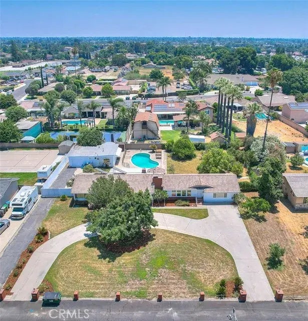 Over half an acre ranch style home with a one bed, one bath ADU and pool! This great property is on the west side of Chino, with a short 5-minute drive to Costco or the Ranch 99 market in Chino Hills. The main home is a 3-bedroom 3 bath one story with appx. 2350 sf. Title shows as a 1918 sf. 2-bedroom 2 bathroom, which does not reflect the garage to living space conversion that added a bedroom and a bathroom. The home has two entrances for a two-family living arrangement, if desired. The home boasts hardwood floors that are in great condition, a remodeled kitchen with white lacquer cabinets and quartz counter tops, a spacious living room with fireplace, and an oversized family room with wood beam ceilings and a fireplace. The family room is stunning with the wood vaulted ceiling and windows viewing to the front and back yards. The kitchen has a gas range, stainless steel sink, recessed lights, and a view to the back yard pool. From the dining area, French doors exit to the back yard covered porch and pool area. The secondary bedrooms are oversized with a hallway 3/4 bath. Dual pane windows are throughout most of the home. A tankless water heater, plus a dedicated water heater for the bedroom addition. There is a storage room near the family room with an exit to the back yard. The primary bedroom has high ceilings, recessed lights, a built-in dresser, and a 3/4 bathroom with a walk-in shower. A large lawn with automatic sprinklers and fruit trees offers country living! A large circular driveway and an additional long driveway with an electric gate and 2 car garage provides a