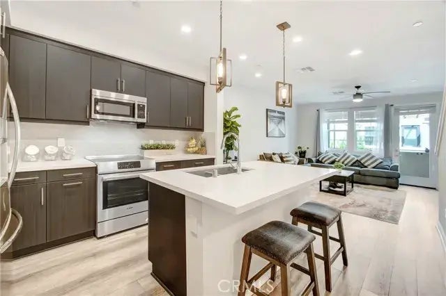Welcome HOME to 10640 Owens Way in El Monte, where modern elegance meets practical comfort, enhanced by the incredible benefit of PAID-OFF SOLAR PANELS! As you step inside, you'll be greeted by a meticulously maintained, south-facing home that perfectly balances sophistication and convenience. My interiors boast high ceilings and stylish wood plank flooring that exude a sense of luxury and warmth. I feature two spacious suites, each designed to provide a private and serene retreat. My sleek, modern kitchen is a culinary dream, outfitted with stainless steel appliances and complemented by elegant silver hardware. Whether you're preparing a gourmet meal or a quick snack, this kitchen is equipped to handle all your culinary adventures. My open-concept living and dining areas are thoughtfully designed for seamless flow, making them perfect for both entertaining guests and enjoying quiet evenings at home. Step out onto my generous balcony, where you can savor your morning coffee or unwind in the evening, all while taking in the tranquil surroundings. The primary suite is your personal haven, offering ample space and a peaceful ambiance. My luxurious primary bathroom features double sinks, premium finishes, a spacious shower, and a separate toilet area, providing a spa-like experience every day. Generous closets are thoughtfully integrated throughout, ensuring you have all the storage space you need. In addition to my luxurious living spaces, I offer practical conveniences that make life easier. Enjoy the convenience of an in-unit laundry room, guest parking for when friends and