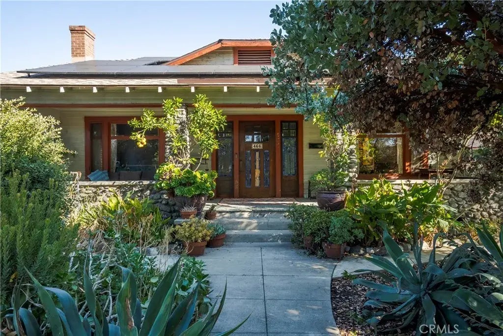 Located in the heart of historic Upland, this beautifully preserved 1912 Craftsman home offers a rare chance to own a piece of Southern California history. A classic example of Craftsman architecture, this one-story clapboard bungalow features a side-clipped gable roof, a central clipped gabled dormer, and exposed rafters in the extended eaves. The front of the house is highlighted by a charming recessed porch, framed by cobblestone piers and a low stone wall. Inside, the home retains its original character with warm wood floors and beautiful built-ins. The living room, complete with a cozy fireplace, flows effortlessly into the formal dining room. The kitchen blends modern appliances with vintage charm, preserving the home's classic appeal. There are three bedrooms, and the full bathroom retains its vintage details. Outside, the private backyard features a sparkling pool and gazebo, perfect for relaxing or entertaining. A detached garage, accessed via a rear alley, provides extra storage or workspace. Recent updates include a newer roof and owned solar panels for both energy efficiency and peace of mind. Situated in a highly sought-after neighborhood, this home is just minutes from downtown Historical Upland, parks, walking paths, and local shops. Whether youre drawn to its historic beauty or excited by the potential to restore it, this Craftsman gem is a true find.