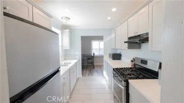 Welcome home to this stunning, fully remodeled 4-bedroom, 2-bathroom house! Boasting a brand-new kitchen with custom cabinets, quartz countertops, a newer garbage disposal, a pull-out faucet, and new dual-pane windows, this home is move-in ready. Enjoy the luxury of newly installed central air and heat, as well as gorgeous new gray rustic laminate flooring in the living room and bedrooms, and custom porcelain tile in the kitchen and bathrooms. The bathrooms feature a new bathtub, beautifully tiled shower walls with elegant mosaic designs, new vanities, and toilets. Newer plumbing fixtures and lighting. A two-car garage with a new roll-up door completes this package. Located in a quiet neighborhood with easy freeway access and close proximity to movie theaters, major grocery stores, gyms, coffee shops, and restaurants, this home offers the perfect blend of comfort, convenience, and style. Priced to sell don't miss out!