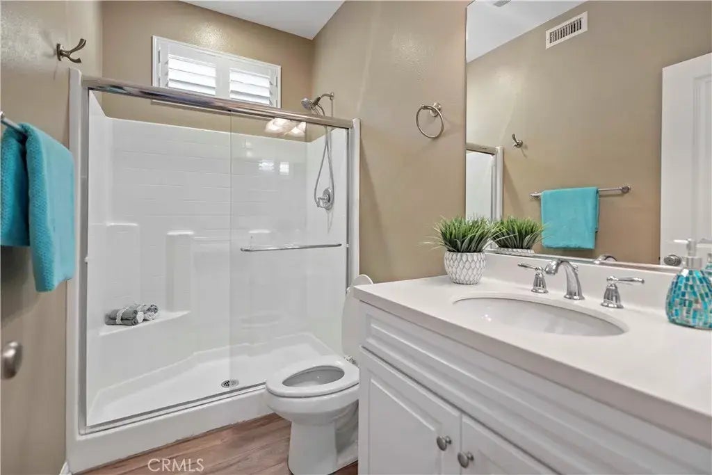 This charming home has 4 bedrooms, 3 full bathrooms with 2310 sqft living space. Brand new laminate flooring and shutters are throughout the whole house. Kitchen is open to the family room, it has granite counters, nice and clean white color cabinets, and the range hood is brand new. One bedroom is downstairs with a full bathroom. One storage is downstairs also. Master bedroom has 2 walk-in closets, dual vanity sink, separate shower and tub. Another 2 additional rooms have one full bathroom with dual sink and a tub/shower. 2 car attached garage. Fully landscape front and rear yard with lemon tree and pairs of trees on a lot 4730 sqft. Centrally located near the big shopping center, easy on 71, 60, 91 fwy. It is a very desirable and convenience area of Chino. You will love this beautiful home and very quiet, friendly neighborhood, enjoy your life.