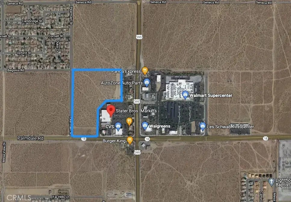 Prime commercial property at the major intersection of Hwy 395 and Palmdale Blvd in city of Adelanto! APNs 3103-521-07 and 3103-521-19 together a total of 22.52 acres. Several national franchises such as Stater Brothers, US Bank, Chase, Starbucks, Subway, Del Taco, Denny's Carl's JR, KFC, Autozone, Panda Express, Dollar Tree, Super Walmart, Wendy's, McDonald's, Walgreens, Taco Bell, Wingstop, and El Pollo Loco are in the adjacent center. The site is zoned for commercial and may be subdivided for future development. Curb, gutters and utilities are already on site, don't miss this opportunity!