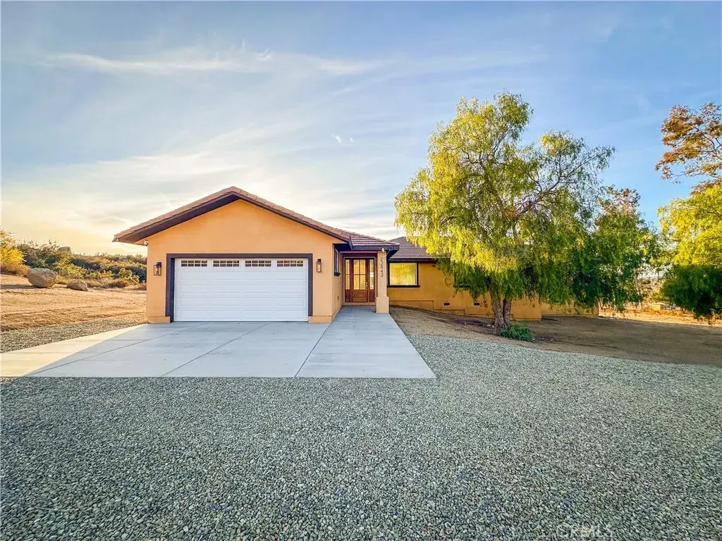 Nestled on nearly 5 acres of land, this brand new home offers the perfect blend of modern luxury and rural living. Completed in December 2024, this 4-bedroom, 2.5-bath home features over 3,000 square feet of beautifully designed living space, with an open floor plan that is perfect for both everyday living and entertaining. Step inside to discover a spacious, light-filled interior, highlighted by stunning picture windows that frame sweeping views of the desert hills and nearby mountains. The chef's kitchen is a true standout, boasting an upgraded design with a striking waterfall island, sleek countertops, and top-of-the-line appliances, all perfect for creating gourmet meals. The home is equipped with modern amenities, including a fully paid-off solar system with battery storage, an energy-efficient electric water heater and AC system, upgraded insulation and noise-blocking foam, and fire sprinklers throughout for added safety. Also features a traffic grade extra capacity septic tank that is accessible for RV cleanout. Enjoy the tranquility of nature with a private rural setting, all while still being within reach of the amenities of Riverside County. With its spacious layout, eco-conscious features, and breathtaking views (especially at sunset!!), this home offers a unique opportunity to immerse yourself in the beauty of California's desert landscape while enjoying all the comforts of a modern, newly built home.