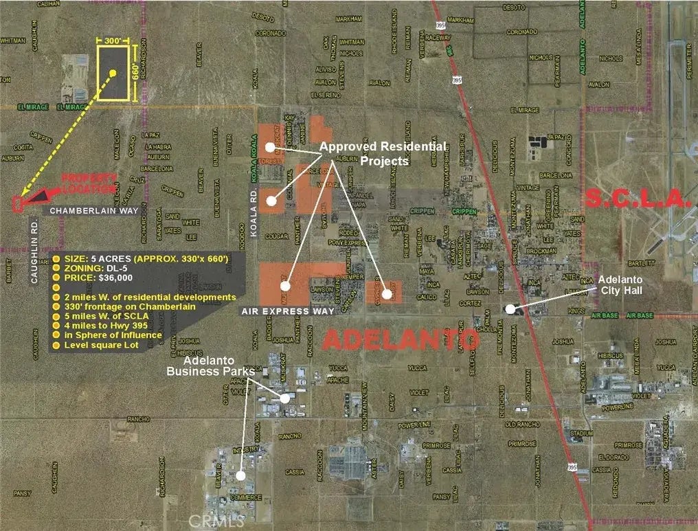5 acres of flat lot, just outside of city limit of Adelanto, perfect for a private solar farm or for a long term investment hold until bigger solar projects begin construction. Many parcels in this area have been assembled by solar farm companies with eyes on this huge business promoted and subsidized by state and federal agencies. The information provided herein is deemed accurate, but buyer and agent to do own due diligence. There are no warranties, express or implied.
