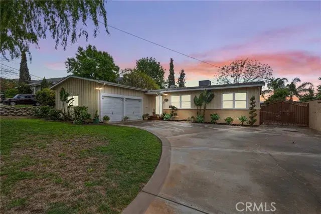 Welcome home to the great City of Grand Terrace! Grand Terrace is known for offering a superb quality of life with a relaxed small-town feel, along with quiet neighborhoods, clean streets, high achieving public school and a safe community environment. This awesome 1,052 appx square foot home features 3 bedrooms, 2 beautifully remodeled bathrooms, with central air and heating, a two car attached garage and RV access and parking. The primary wing of this home features a private ensuite with a 3/4 beautifully remodeled bathroom, large closet with storage above, linen closet and its own private entrance. The updated kitchen has an eating area, with a window view to the grand back yard. The cozy living room has been updated with recessed lighting, all with double pane windows, blinds and ceiling fans throughout. This garage offers two newer garage doors which open independently of each other. The laundry hookups, along with a sink vanity are located inside the garage. This garage also offers an area that was built out as office space. This home sits on a large 11,850 square foot beautifully landscaped lot. The front exterior of the home features a large driveway, capable of parking several cars. Large front yard with a beautiful signature mature tree that provides an enormous amount of shade. The completely fenced in large back yard is landscaped complete with a covered lighted patio area great for entertaining. There are also several fruit trees strategically planted in this back yard. This home has an enclosed side yard for pets, storage or parking another vehicle. The RV acce