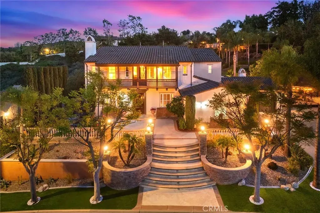 The Luxury semi-custom Spanish Colonial Style home in in the Gated Vellano community. It has 6 bedrooms and 6.5 Bathrooms (each bedroom has its full bath), of which 2 bedrooms and 2.5 bathrooms are located on the first floor, 4-car garage. There is also a bonus room upstairs. The primary suite has his and hers walk-in closets and a large private balcony to enjoy the mountain & city lights views. A welcoming fountain is in the front yard of the main entrance. The beautifully designed marble mosaics sit in the premium wood floor, which cover all the rooms. The living and family room has its own fireplace. The formal dining room has 2-story high cathedral ceiling and custom chandelier. Gourmet kitchen is equipped with the granite counter tops and high-end Appliances. Other notable features include customized curtains and wood shutters, crystal chandelier, recessed lights, ceiling fans, crown moldings, surrounding sound system, central vacuum, large driveway, water fountains, private side gate, RV parking, and 57 solar panels (Paid Off). The expansive backyard is a truly private oasis, designed for both relaxation and grand-scale entertainment. Surrounded by mature palm trees, many fruits trees and lush greenery, the outdoor space features a sparkling swimming pool, spa, and customized water-creek with Koi Pond. A professionally manicured putt-green provides fun for golf enthusiasts, while the patios with string lighting creates a perfect setting for evening gatherings. Built-in BBQ Island with bar seating and a fireplace enhances the alfresco lifestyle. At the rear hillside, a