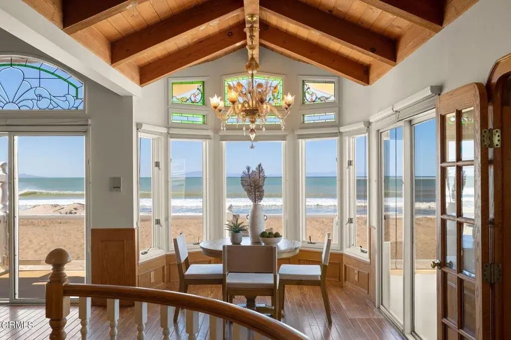 Step into the coastal charm of this Cape Cod-style beachfront home on Pierpont Beach! With five bedrooms and five bathrooms, this home offers 3,300 square feet of thoughtfully designed beach living set against a breathtaking 85-foot stretch ofoceanfront.Constructed in 1981, it has all the bells and whistles of its time--think open-beam vaulted ceilings, Oak and Onyx details, and four fireplaces. The ground level opens up to a living space with three bedrooms that open to the private outdoor area, including a fire pit, shower, and private beach access.An oak spiral staircase leads to the main living area, which offers unparalleled views of the Channel Islands. This floor is thoughtfully arranged with a fully equipped kitchen, wet bar, dining space, lounge area, guest bathroom with a clawfoot tub, private secondary suite with ocean views, a fireplace, an ensuite bath, and a walk-in closet.Continue up another staircase lit by a stained-glass ceiling to the top-floor primary suite, with an oceanfront spa bathroom featuring a soaking tub and sauna.Enjoy an unlimited stretch of sandy beach and the privacy of an oceanfront home. With panoramic ocean views, Channel Islands, and Ventura Pier, this property is the perfect canvas to transform classic charm into a contemporary coastal dream house.