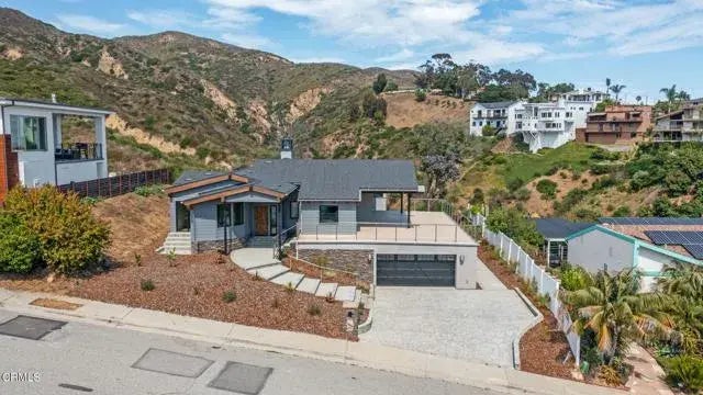 Approximately 3232 square feet, 4 bedrooms & 4 Baths and over 1000 square feet of viewing deck. The garage is 640 square feet and there is a separate 1-level ADU with private entrance on the lower level. All bedrooms and bathrooms are on the main floor, and the lower-level game room is approximately 280 square feet, with access to a rear-covered patio which provides views of the San Jon Barranca plus the hills above. The spacious and open beamed ceilings in the living room and dining area, with gas fireplace and Quartz stone facing, brings in the natural elements to the indoors, while the two sliding doors from the kitchen and living room lead to the massive 1000 square foot partially covered viewing deck. Wood plank flooring is laid throughout the home. The expansive floor plan features a high-end kitchen which includes Viking appliances, a6-burner stove and convection oven, side-by-side refrigerator, microwave, and dishwasher. Gorgeous veined quartz countertops, large kitchen island, Viking Range hood, Shaker style cabinets with tons of storage, plus a walk-in pantry. The breakfast nook enjoys views of the mountains. You will relax and feel the comfort in the sizeable primary suite, within the cozy sitting area and views of the ocean, and private sliding door to front yard. The generous primary bathroom with two sink vanity and Quartz countertops, along with the free-standing soaking tub and separate designer tiled shower gives you your own personal spa. The walk-in closet with pocket doors, tucks away for a sleek clean look. The laundry room is fitted with 220 and gas. T