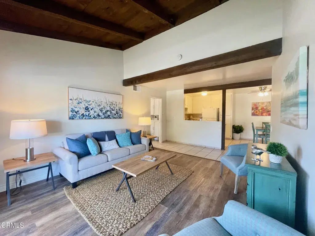 Step into this charming 2BR/1BA condo nestled in the Peppertree community of Ventura. Featuring vaulted beamed ceilings, wood-like floors, and an airy open concept, this home is bathed in abundant natural light. Enjoy your own private patio, perfect for relaxing or entertaining. The well-appointed kitchen includes all appliances, laminate countertops, and a cozy dining area. HOA amenities cover trash, water, sewer, and provide access to a community clubhouse, indoor pool and spa, gym, tennis courts, several onsite laundry rooms, and central mailbox service. Additional perks include a 1-car detached garage and an assigned parking space for your convenience. Located near the beach, shopping centers, hiking and biking trails, and freeway access, this condo offers a convenient and comfortable lifestyle. Don't miss the opportunity to make this lovely property your new home sweet home!