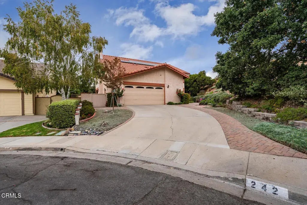 Welcome to this lovely traditional gem on a full acre in the heart of Thousand Oaks. A mix of comfort and convenience, this home boasts a remodeled kitchen with ample cherry cabinetry, granite counters, a large island and kitchen eating nook. Most windows have been replaced, bathrooms have been remodeled, the furnace and a/c are newer, roof has been replaced @ 5 years ago, and hardwoods have been added to the 2nd story. Solar panels afford low to no electric bills! The large airy rooms on the first level include a formal dining room, spacious eat-in kitchen, formal living room with fireplace , sunken family room with fireplace, half bath and separate laundry room. The 2nd level boasts 3 generously sized bedrooms with remodeled baths. The primary suite overlooks the pristine garden and has an adjacent room with a closet which could function as an office or 4th bedroom. The primary bath has been remodeled to include a glass enclosed shower. The walk-in closet off the primary bedroom has been reorganized to maximize its generous size. From the main level, you can meander into a magical garden filled with pathways that provide your own outdoor sanctuary. There is ample room for an ADU, or for a private vineyard or orchard. This property is also zoned for horses. There are 3 different patio areas allowing numerous entertainment options with a zen atmosphere. Even the 2 car attached garage has extra room for storage or for a workshop. The prime location at the end of a cul de sac allows easy access to the 101, TO mall, restaurants, Los Robles Greens and hiking trails. All the maj