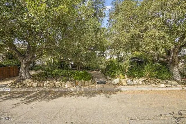 Welcome to your own artistic retreat in the desirable Santa Paula Oaks! This 1920s charmer captures the essence of vintage elegance with its original coved ceilings and rich oak hardwood floors. Stepping inside, you'll immediately feel the unique character of this home, brought to life by classic architecture and curated treasures, including an 1800s Danish apothecary medicine cabinet in the kitchen and intricately carved Indonesian doors leading to the hallway and bedrooms. The kitchen shines with quartz countertops, newer cabinets, custom single-basin sink, and a freestanding Wolf range. The thoughtfully updated bathroom boasts a tiled floor, walk-in shower, and a natural stone sink, blending style with function. Situated on a sprawling quarter-acre lot, this property is shaded by five majestic oak trees, creating a peaceful, wooded oasis with ample space for a potential detached ADU. This lovingly maintained home has seen numerous essential upgrades throughout the years, from a newer sewer lateral line and flat roof to modernized waste and water supply lines, electrical system, ductless mini-split A/C, energy-efficient dual-pane windows, and a whole-house water filtration system. Don't miss the chance to own this truly one-of-a-kind home, a rare blend of history, charm, and comfort with included treasures that set it apart from the rest!