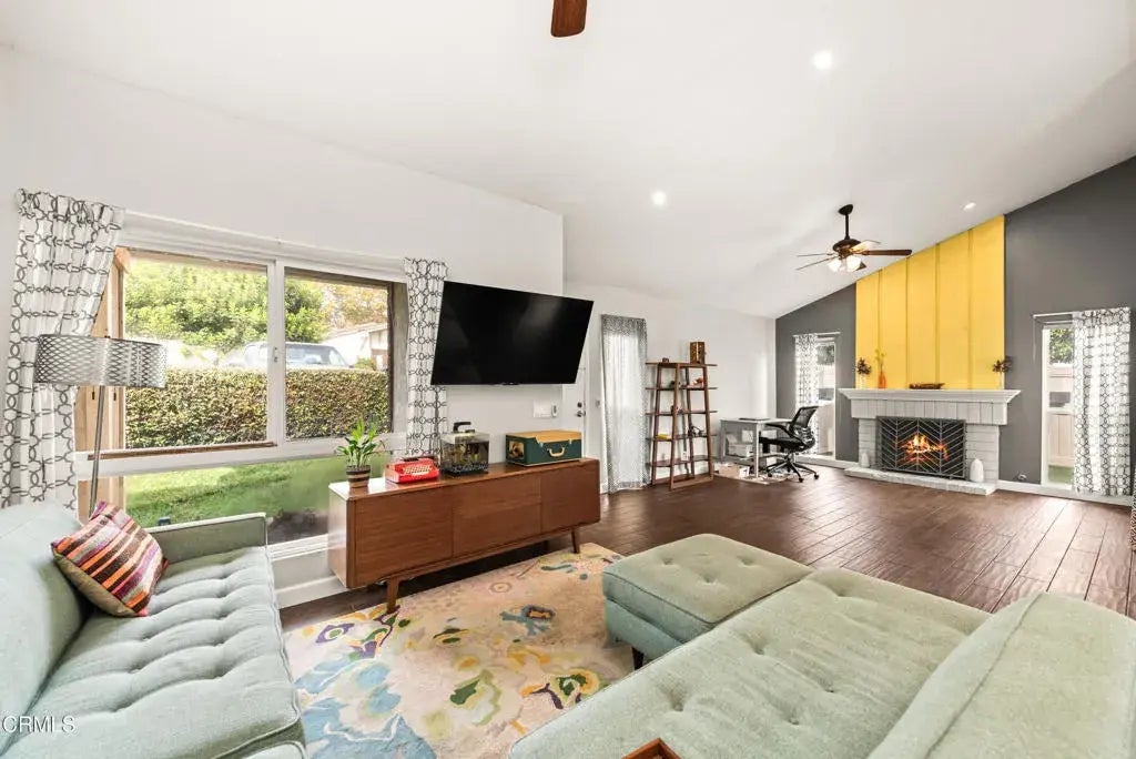 Beautiful, move-in ready single-story home in the highly sought-after gated community of Orchard Lane in Ventura! This 2-bedroom, 2-bathroom residence features an open and airy floor plan with vaulted ceilings and an abundance of natural light from dual-pane windows. The updated kitchen boasts sleek quartz countertops, a breakfast nook with quartz countertop, tile backsplash custom cabinetry, and stainless steel appliances, while both bathrooms have been tastefully remodeled with custom tile work. Additional highlights include wood-like flooring, recessed lighting, and a cozy fireplace that was updated to code prior to these owners moving in with newer gas line and spark arrestor for the chimney. Furnace was moved up to the attic. Others have converted space above the kitchen to an additional loft room with all the space above the kitchen ceiling for an additional room. Kitchen has quality appliances like the Kucht Gas Burner, built-in microwave, and built-in dishwasher. Front yard has wired lighting for landscaping on timers. Back yard has an electric box installed on exterior top left corner of the patio cover with a switch for Christmas lights.Positioned in one of the best locations within the Orchard Lane community, this home offers direct access to a pool and a spacious, grassy area right behind the backyard--ideal for relaxing or entertaining. A detached 2-car garage is just steps away. Water softener hookups. $517/month HOA dues include: Water, Trash, Sewer, Pool, Hot Tub, and gated community. Don't miss the opportunity to make this exceptional property your new home