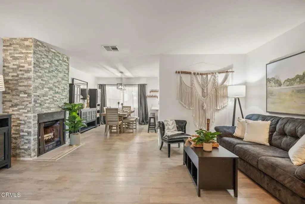 Welcome to this lovely and upgraded 2-bedroom, 3-bath home, plus bonus room, perfectly situated in the heart of Ventura. Offering a blend of modern comfort and coastal charm, this property is ideal for those seeking a stylish and low-maintenance lifestyle! The open concept living area features a beautiful stack-stone gas fireplace, dining room, half bath and slider doors leading to the balcony, a great place for your morning coffee or beverage at sunset. The light and bright kitchen has white shaker cabinets, stainless steel appliances, quartz counter-tops and eat-in breakfast bar. Upstairs, the spacious primary suite and secondary bedroom both have custom closet organizers and remodeled baths. The bonus room is perfect for a home office, den or 3rd bedroom. Additional features of this upgraded home include luxury vinyl flooring throughout, dual pane windows, recessed lighting, water system for whole house, furnace was replaced in 2019 and attached 2-car garage. This community offers a pool & spa, and HOA dues include common area lighting, landscaping and trash service. Located just minutes from Ventura's vibrant downtown, beaches, shopping, restaurants, Government Center, Trader Joe's, Pete's Coffee and more, plus easy access to the 101 & 126 Freeways. Whether you're looking for a weekend getaway or a permanent residence, this home has everything you need to enjoy the best of Ventura living!