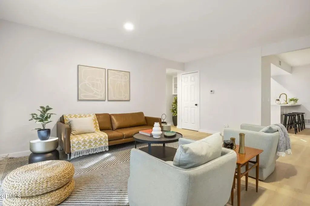 Turnkey single-story unit in Ventura's rarely available Venwood Community! Just one mile to the beach and Downtown Ventura, this fully renovated gem is primely situated on the floor level, and ideally oriented to enjoy views of the community's greenscape. The private entrance welcomes you with a modern coastal aesthetic featuring brand new wide plank flooring, crisp new interior paint, and all new designer fixtures throughout. The ideal open concept floorpan flows from the kitchen to both the dining, and large living room that center around glass sliding doors leading to the private back patio- perfect for outdoor lounging, dining, or hosting friends while enjoying warm Ventura evenings. Brand new gourmet kitchen is complete with calacatta quartz countertops, all new stainless steel appliances, farm sink, custom soft-close cabinetry, and convenient breakfast counter bar. The unit offers two bedrooms, and 1.5 baths, including the spacious primary bedroom with oversized closets, and a fully renovated bathrooms featuring all new shower wall tile, new vanities, fixtures, and flooring. Additional highlights include convenient laundry hookups inside the attached 2-car garage, new furnace, new water heater, and new recessed LED lighting. Located just minutes to the beach, parks, schools, shopping, restaurants, freeway access, and all that incredible Ventura has to offer! Don't miss this great opportunity!
