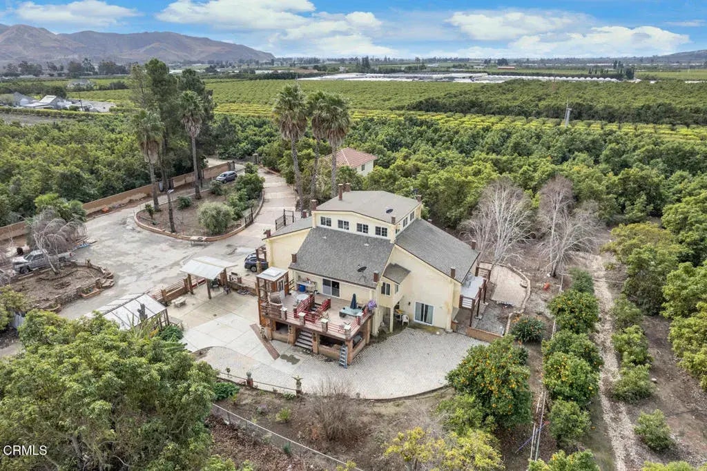 A rare opportunity to own a stunning estate featuring a 4,000+ square foot home on over 6 acres of flat, usable land. This income-producing property generates approximately $75,000 annually through its thriving avocado orchards and a detached two-bedroom guest house. Additionally, the estate includes a valuable investment--ownership of five rare water shares.The expansive main house welcomes you with a grand foyer leading into an open-concept great room that seamlessly blends the living, family, and dining areas, complete with a cozy fireplace. The upgraded kitchen boasts a breakfast nook, modern appliances, and ample counter space. A primary suite on the main level offers a private retreat with a separate shower and tub, plus a balcony overlooking the lush orchards. Step out onto the spacious patio for panoramic orchard views, and enjoy the convenience of an elevator and an attached two-car garage.Downstairs, you'll find a second primary ensuite with a 3/4 bath, along with two additional bedrooms and a full bathroom. One of these bedrooms is currently utilized as an office and features a private patio. For added flexibility, the lower level has a separate entrance from the parking area, providing potential for multi-generational living or rental opportunities.Beyond the main residence, the estate includes a well-maintained avocado orchard and a detached 5,000SF (est) fully enclosed barn/warehouse that includes 3 bays with separate doors and a covered carport--ideal for agricultural or hobbyist use. The guest house offers comfortable living with two bedrooms, 2 full bathroo