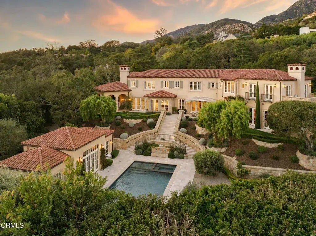 Tucked away in one of Montecito's most coveted neighborhoods, this magnificent Mediterranean estate captures mountain and ocean views. A seamless fusion of elegance, scale, and romance, the property boasts a stately 4-bedroom, 5 full/2 half-bath main residence, a refined private guest retreat with a luxurious poolside cabana, and impeccably landscaped grounds. Meandering pathways wind through lush gardens featuring roses, Hong Kong orchids, and vibrant citrus trees, creating an enchanting atmosphere. Designed by acclaimed architect Don Nulty, AIA, the estate reflects timeless European influences, with sunlit rooms that frame sweeping views of the surrounding hills. A grand entrance introduces a gracefully curved staircase, while arched windows and French doors invite natural light and a sense of openness throughout. Ideal for Montecito's renowned indoor-outdoor lifestyle, the residence offers multiple covered terraces, a fully equipped outdoor kitchen, and an inviting stone fireplace - perfect for savoring golden-hued sunsets. The spectacular pool and spa, framed by elegant stone stairways and lush greenery, offer a serene retreat. For added relaxation, an outdoor sauna provides the perfect escape for rejuvenation and tranquility. The main level is designed for effortless entertaining, with spacious living areas that flow seamlessly onto alfresco dining patios. The upper level hosts four sumptuous bedroom suites, each with a private bath. The romantic primary suite enjoys ocean views, a cozy fireplace, dual closets, and a luxurious en-suite bath, opening to a private balcon