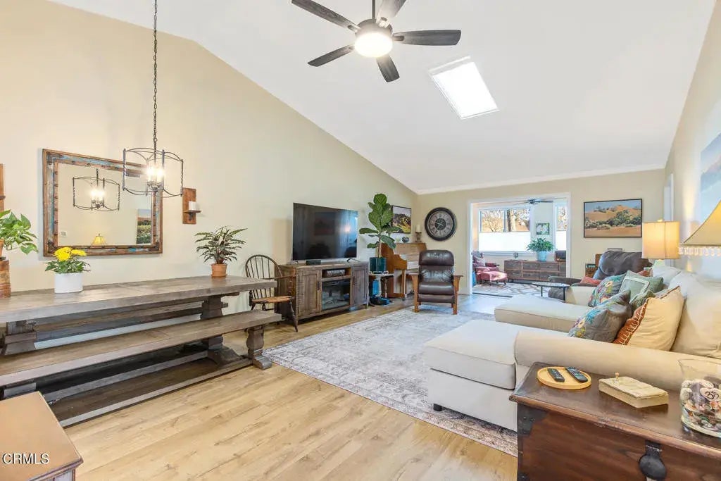 Welcome to this beautifully remodeled 2-bedroom, 2-bathroom home in the desirable Leisure Village 55+ community. Thoughtfully redesigned, this home now features two master suites, offering flexibility and privacy to suit your lifestyle. The open-concept layout creates a spacious and inviting environment, perfect for entertaining or unwinding. A patio enclosure room adds approximately 175 square feet of extra living space, bringing the total to about 1,240 square feet. This charming room, with its knotty pine ceiling and recessed lighting, is a cozy retreat for year-round enjoyment. Natural light floods the home through new skylights in the living room, kitchen, hallway, and master bathrooms. The entire interior has been updated with wood-laminate flooring, tile in the bathrooms, fresh paint, crown molding, new baseboards, and upgraded interior doors with antique bronze hardware. The kitchen is a chef's delight, featuring new appliances, soft-close cabinetry, quartz countertops, a stylish farmhouse sink with a Moen fixture, and a new tile backsplash. The space is beautifully illuminated with dimmable lighting and remote-controlled under-cabinet lights for added convenience. Both master suites are designed for comfort and style. The primary suite offers a remodeled closet with custom shelving and a TV/media nook with built-in drawers. The expanded master bathroom boasts a dual-sink vanity, a new tub with Newport Brass fixtures, and quartz countertops. The second bathroom has also been updated with modern tile and fixtures. Recent upgrades include a 2018 HVAC system, a new ele