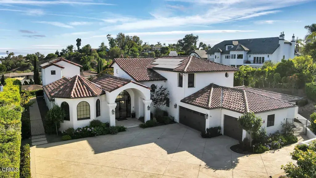 Step into your personal sanctuary where art meets architecture. Beautifully reimagined and masterfully updated and expanded in 2020, this exquisite two-story home touches on elegance and zen with thoughtful color choices and finishes. The dramatic foyer offers the open space of contemporary design and indoor-outdoor living with two glass-door passageways and custom statement lighting fixtures illuminating the travertine and marble floors. Off the entry is a vaulted ceiling office with gorgeous cabinetry. The office flows to the primary suite which has been entirely expanded and updated including a secret 'crow's nest' retreat. High-end materials and finishes give a sophistication to the entire primary suite. Situated to take advantage of views of the city, the Santa Monica mountains, and Point Mugu. The inviting gourmet kitchen with quartzite counter island seating, Dacor appliances, a spacious dining area with a show stopping chandelier, and adjacent cozy family room flows easily to the fully covered al fresco dining on the rear loggia with built-in heaters for entertaining comfort. An impressive 280-gallon, saltwater fish tank is absolutely mesmerizing. A nautical theme is felt throughout the home from color schemes to hidden treasures. The downstairs has two bedrooms and laundry (with a dog wash), and the upstairs has an additional family room/loft, two bedrooms, two bathrooms and a flex space that is currently used as a gym. A second upstairs patio off the family room offers more seating and relaxing with beautiful views. This smart home with cameras, security, and Ipad