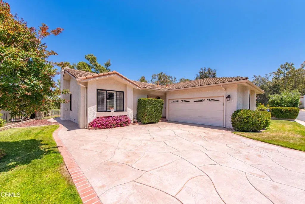 Views, views, views! Welcome to this beautifully updated single-story home, where stunning golf course and mountain vistas provide a serene and scenic backdrop to everyday living. Bathed in natural light, this charming residence is nestled within the highly desirable 55+ gated community of Camarillo Springs. It offers 2 spacious bedrooms, 2 bathrooms, 1,561 sq ft of inviting interior space, and sits on a generous 5,227 sq ft lot. The cheerful eat-in kitchen is both stylish and functional, featuring eye-catching blue cabinetry, Corian countertops, a mobile island, Pergo flooring, and a pass-through to the living room that creates a seamless, open feel. The expansive living room boasts vaulted ceilings, newer plush carpeting, and a white brick fireplace with a classic mantel, an ideal space to relax or entertain. Sunlight pours in through the large windows and sliding glass doors, leading you to a private backyard patio with a retractable awning, which is perfect for enjoying your morning coffee or alfresco dining beside the picturesque 9th hole. The primary suite serves as a tranquil retreat with vaulted ceilings, a large walk-in closet, direct patio access, and an en-suite bath with a walk-in shower and single-sink vanity. The secondary bedroom also offers direct access to the hallway bathroom, making it a perfect guest room or optional second suite. One of the home's unique features is a second laundry area in the garage, allowing the indoor laundry room to be reimagined as a craft room, gym, office, or whatever inspires you. Additional highlights include newer dual-pane w