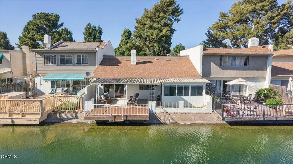 Welcome to lakeside living at 1656 Shoreline - a rare waterfront home in Camarillo's sought-after Lakeside Village. Set directly on the water with a private, gated deck, this residence feels like a page from a design magazine and the kind of peaceful retreat everyone dreams about. Watch friendly ducks glide by, spot turtles sunning on the banks, and enjoy catch-and-release fishing right from your own deck. Launch a kayak, canoe, or paddleboard and explore the meandering lake, then unwind under the large covered patio while the water shimmers around you. You are greeted by a custom sand finished colored concrete driveway that leads to a private rock faced gated courtyard that sets the tone. Inside, the home blends warmth and style with highly curated updates. The finished, enclosed courtyard front room showcases soaring ceilings with exposed beams, skylights that invite in the sunshine, recessed lighting, and wide-plank wood-look flooring for a seamless, coastal feel and adds an additional 400 square feet of space for your enjoyment. The main living space opens through large sliders and leads to the patio - perfect for effortless indoor/outdoor entertaining. The remodeled kitchen is both beautiful and functional, featuring quartz counters, a textured stone backsplash, modern hardware, and sleek appliances - an ideal workspace for everyday meals or weekend gatherings. Two comfortable bedrooms and two updated baths provide easy single-level living. The serene primary suite enjoys sparkling water views and flows into an enclosed, patio/sunroom--offering an additional 100 sq fee