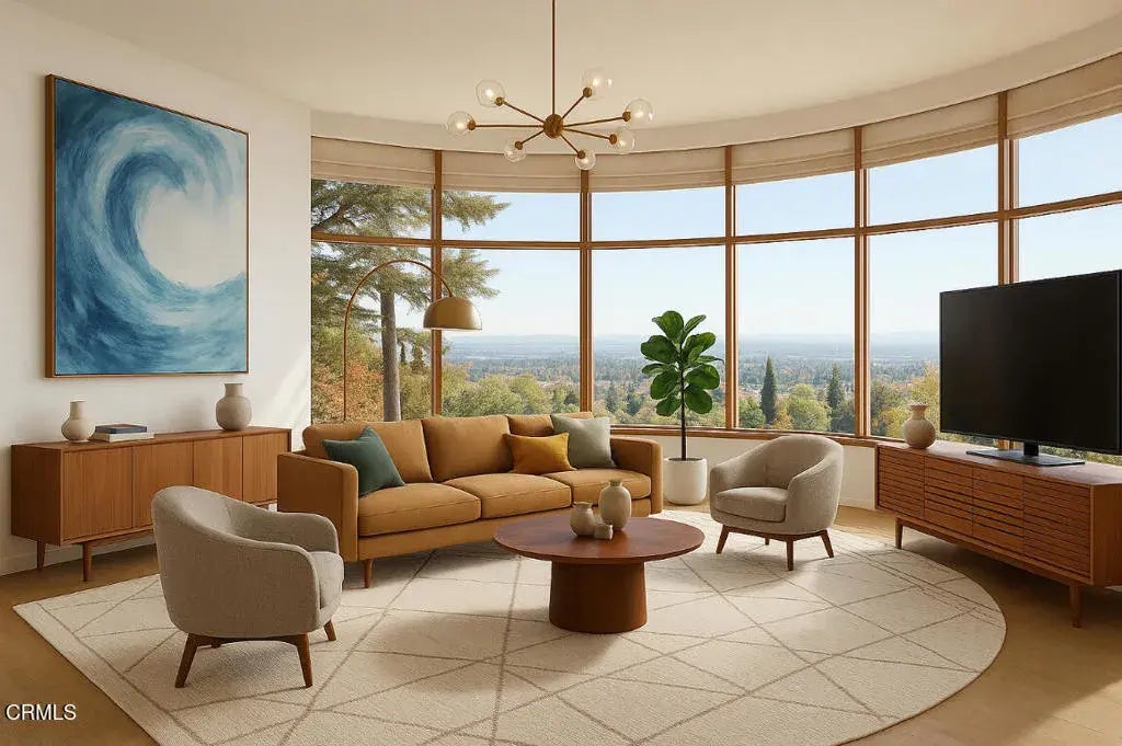 This stunning Mid-Century Modern home on the hillside is truly breathtaking. Boasting an impressive 240-degree panoramic view of the ocean and Ventura County, every glance from inside or outside feels like a retreat to the countryside, surrounded by pine trees and lush foliage.The property is just under one-third of an acre and features 4 bedrooms plus an office/den Enjoy the comfort of three recently renovated bathrooms and a charming spiral staircase leading to the lower level.The oversized garage provides ample space for up to six smaller vehicles, or it can be partially converted into a workshop. Adding to its unique appeal, the property includes a 1960's Avion RV currently rented at $1,800 per month--enough to cover taxes and utilities, leaving you only the mortgage to handle.With five spacious decks, this home is designed for indoor-outdoor living, offering multiple places to relax, entertain, and soak in the stunning views. The property also boasts a fully-owned solar panel system--oversized to accommodate future electric vehicle charging needs-- delivering both energy efficiency and long-term savings.This rare property offers the best of both worlds--the tranquility of country living combined with the convenience of city life.2 photographs were ai generated. Information deemed reliable but not guaranteed. All information, including but not limited to square footage, lot size, property boundaries, features, upgrades, condition, and school district, is provided by third parties (such as public records, seller, or others). Neither the seller nor the broker/agent has ve