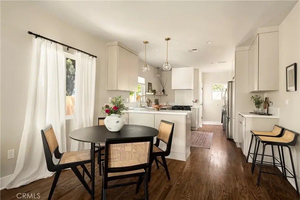 An artistic vision brought to life with warm organic woods, soft colors and large sun-lit windows that transform this 1924 bungalow into a tranquil sanctuary. With room to expand, approved plans for a 653 sf ADU allow for greater potential. Nestled in the heart of El Sereno, an eclectic and burgeoning neighborhood, this home offers more than meets the eye. As you approach the front door, the charming porch welcomes friends and neighbors to sit for quiet conversations. Inside, restored original wood floors lead you through open spaces in the living room and dining area. An impressive chef's kitchen invites guests to linger for a meal or to step outdoors to dine al fresco. Fully equipped with Samsung stainless steel appliances, the kitchen highlights bespoke cabinetry, quartz countertops, open shelving and a custom stove hood. Integrated into the space, the laundry area has a side-by-side washer and dryer, a folding station and upper cabinets for storage. Through the hallway, find a custom linen closet, two bedrooms and a beautifully remodeled bath with neutral zellige tiles and green hexagon floors. Outside, nicely landscaped gardens offer multiple areas for festive gatherings. A long spacious driveway leads to the full-fenced backyard and a spacious 10' x 12' shed that offers flexibility for storage or a workspace. Featuring all new systems including HVAC, new roof, 200-amp panel, new plumbing, new windows, EV charger, and more. Discover the trails at Ascot Hills or check out local favs including James-Beard nominated Evil Cooks, El Aguila Bakery, Antiguas, Hecho en Mxico,