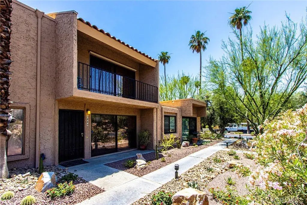 Tanquitz Creek Golf Course neighborhood! Cozy Two Bedroom Suite surrounded by the beautiful lush landscape. Amazing Golf course and mountain views! Very spacious 2 bedroom suite, one with high vault ceiling and both has its own balcony, furnish with one Kind and one Queen size bed upstairs. Downstair has one great room furnish with a sofa bed and it comes with a full bath restroom. Gourmet Kitchen, comfort dinning, smart home features remote AC thermostat and smart door lock, filtered bath/shower and drinking water system. Beautiful community pools & spas, exercise room, tennis and pickleball courts. 15 minutes drive distance to Downtown Palm Springs, near Casino and hiking trailheads, short distance to airport, dinning, entertainment and shopping ect. Rent Terms negotiable from month-to-month or long term, $2,500-2,800 June -Dec. $3,000-3,300 Jan-May. NO smoking. Home is freshly painted and furnished for easy move in with basic living essentials available. Welcome come to stay and enjoy. (Vitural Tour Link refer to prior staging, Photos is reflecting current furnishing.)