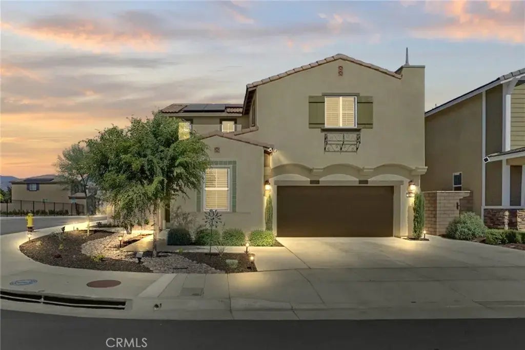 PAID OFF SOLAR! Lower Mello Roos Tax For a 2022 Built! Welcome to this stunning newer 2022-built home nestled in the highly desirable Lennar Master Community at Traditions of Redlands. Experience modern living in this meticulously renovated home, perfectly situated on a quiet CORNER Prime Lot. With many high-end upgrades, this compound feels just like a Model Home. The extended custom driveway and walkway front entrance, along with a professionally landscaped front yard, enhance the homes inviting, gorgeous curb appeal. As you step inside, you're greeted by an open, airy layout anchored by a bright living room showcasing soaring high ceilings, recessed lighting, luxury flooring, and a sophisticated custom light fixture. Featuring 4 Bedrooms, including a versatile Main-Floor room ideal for guests or a private home office and 2.5 bathrooms, this home is perfect for growing families. The entire space is filled with natural light that beams through energy-efficient windows adorned with elegant plantation shutters. The living area flows effortlessly into a stylish dining space and a Modern Kitchen featuring stainless steel appliances, quartz countertops, an oversized Center Island, crisp white cabinetry, and a walk-in Pantry perfect for the avid home chef. A sliding glass door leads to an entertainer's dream private backyard with top of the line Stamped Concrete flooring, built-in lighting along the retaining planter, and ample space to enjoy the California weather. Ascend the beautifully crafted staircase upstairs to find a spacious Loft, Two generous Bedrooms, a Full Bathroom