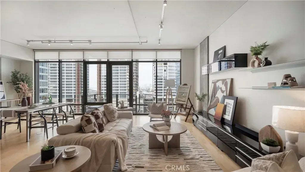 This spacious 1-bed/1-bath loft-style condo features a balcony with operable door and sweeping west-facing views of LA Live, Crypto.com Arena, and vibrant sunsets framed by floor-to-ceiling glass. Meticulously maintained by its original owner, the home blends modern upgrades with an open layout that maximizes light and space. Highlights include a custom closet system, sleek glass-enclosed bath, stainless steel appliances with Bosch quiet-mode dishwasher, track lighting for art or ambiance, and a full-height cabinet that provides ample storage while integrating seamlessly with the living space. The defined bedroom, enclosed by a sliding Hunter Douglas fabric panel, offers privacy while maintaining the lofts airy feel. At Luma, one of South Parks premier LEED-certified luxury towers, residents enjoy 24-hour security and concierge, a resort-style pool and spa, fitness center, and outdoor BBQ lounges. Renowned for its modern design and prime location just steps from LA Live, Luma offers the perfect combination of style, convenience, and community in the heart of Downtown Los Angeles, surrounded by acclaimed restaurants, nightlife, entertainment, and professional sports venues. A Must see.
